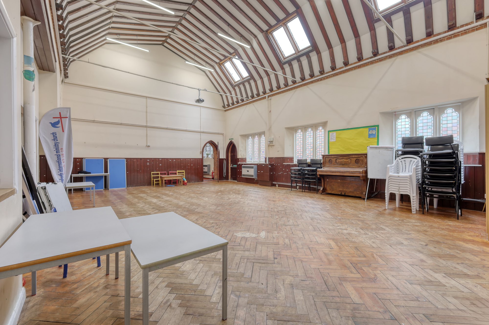 This purpose built church, currently benefitting from F1 Use, offers approximately 3,042 sq. ft. of space. The property includes two spacious halls, a side lobby, vestry, kitchen and a restroom facilities. At the front there is a large porch and potential to install a dropped curb to provide parking for two vehicles. Both halls can comfortably accommodate around 100 people each, making the space ideal for worship services and community making the space ideal for worship services and community events.