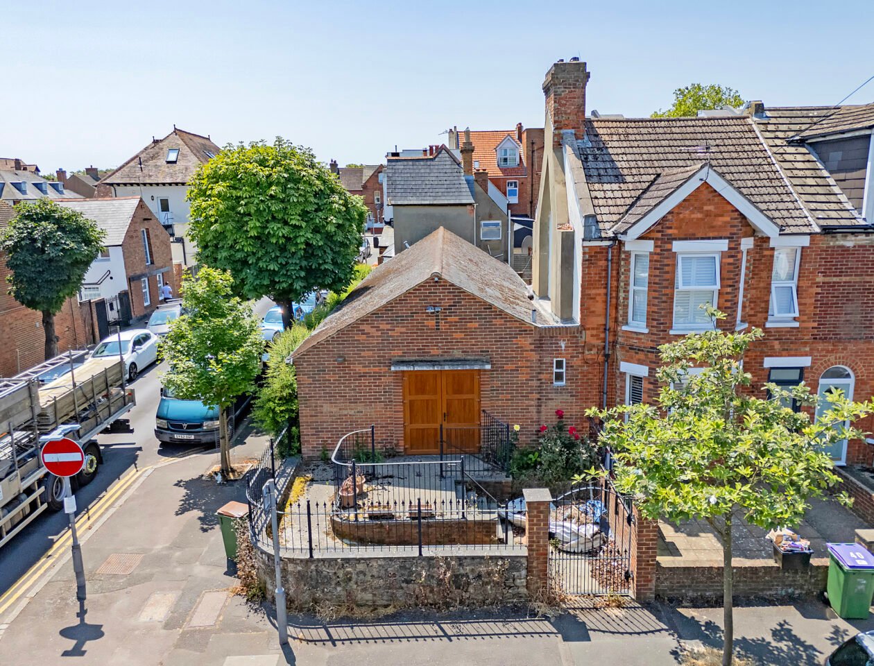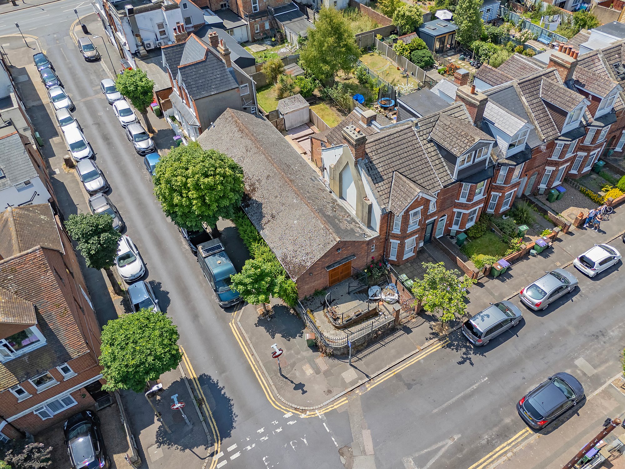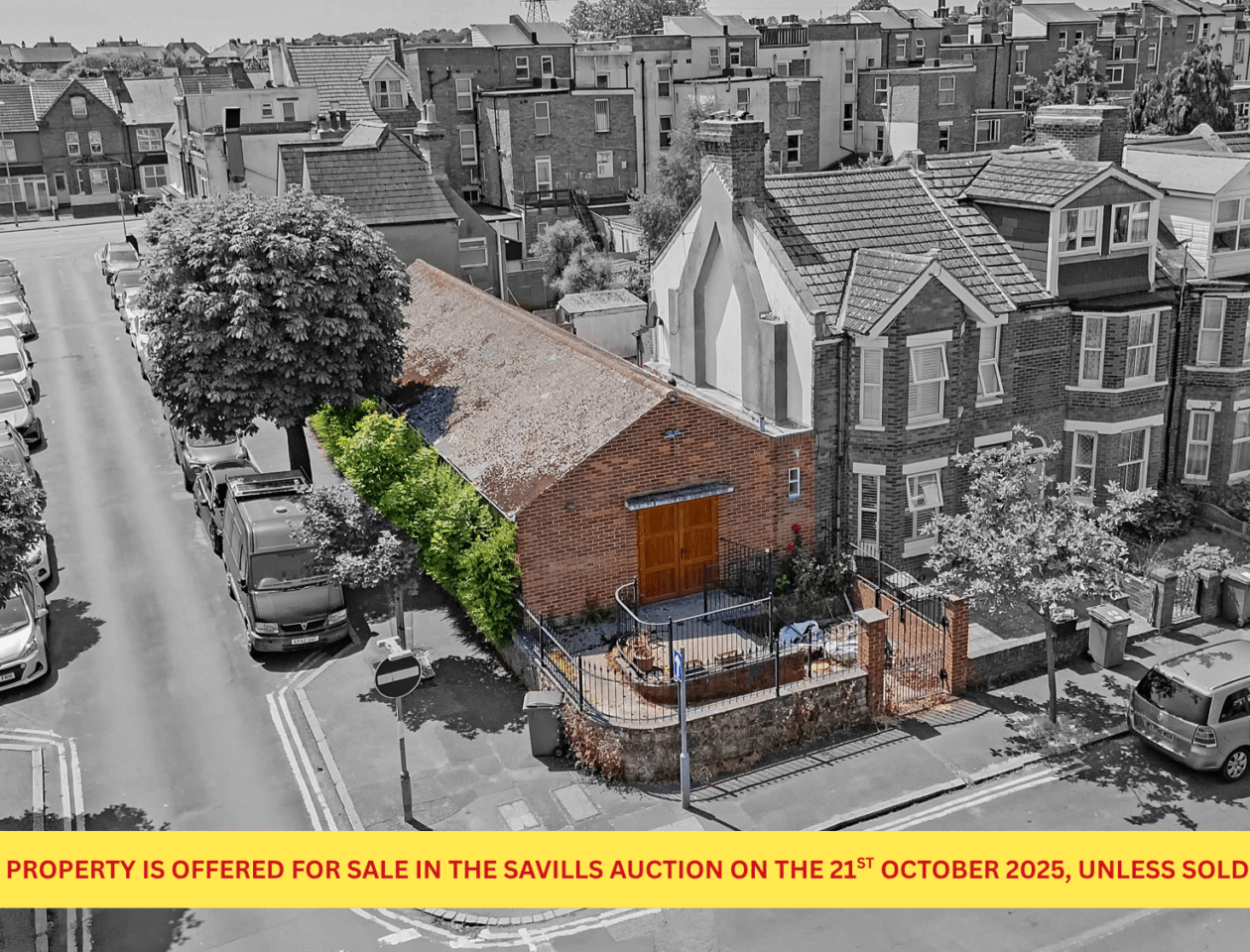 This unique property comprises a former church hall building situated on Morehall Avenue in Folkestone. Providing approximately 1,215 sq. ft. of internal space, it features a large open-plan hall alongside ancillary rooms, including two kitchens and WC facilities. Positioned on a prominent corner plot with a gated front courtyard, the property offers excellent visibility and convenient access to local amenities. Retaining many original character features, it presents great potential for a range of uses, making it ideal for continued religious, educational, or alternative commercial purposes.