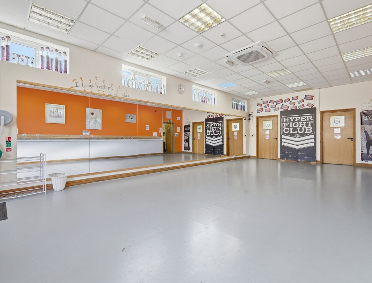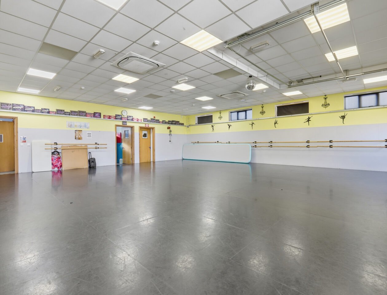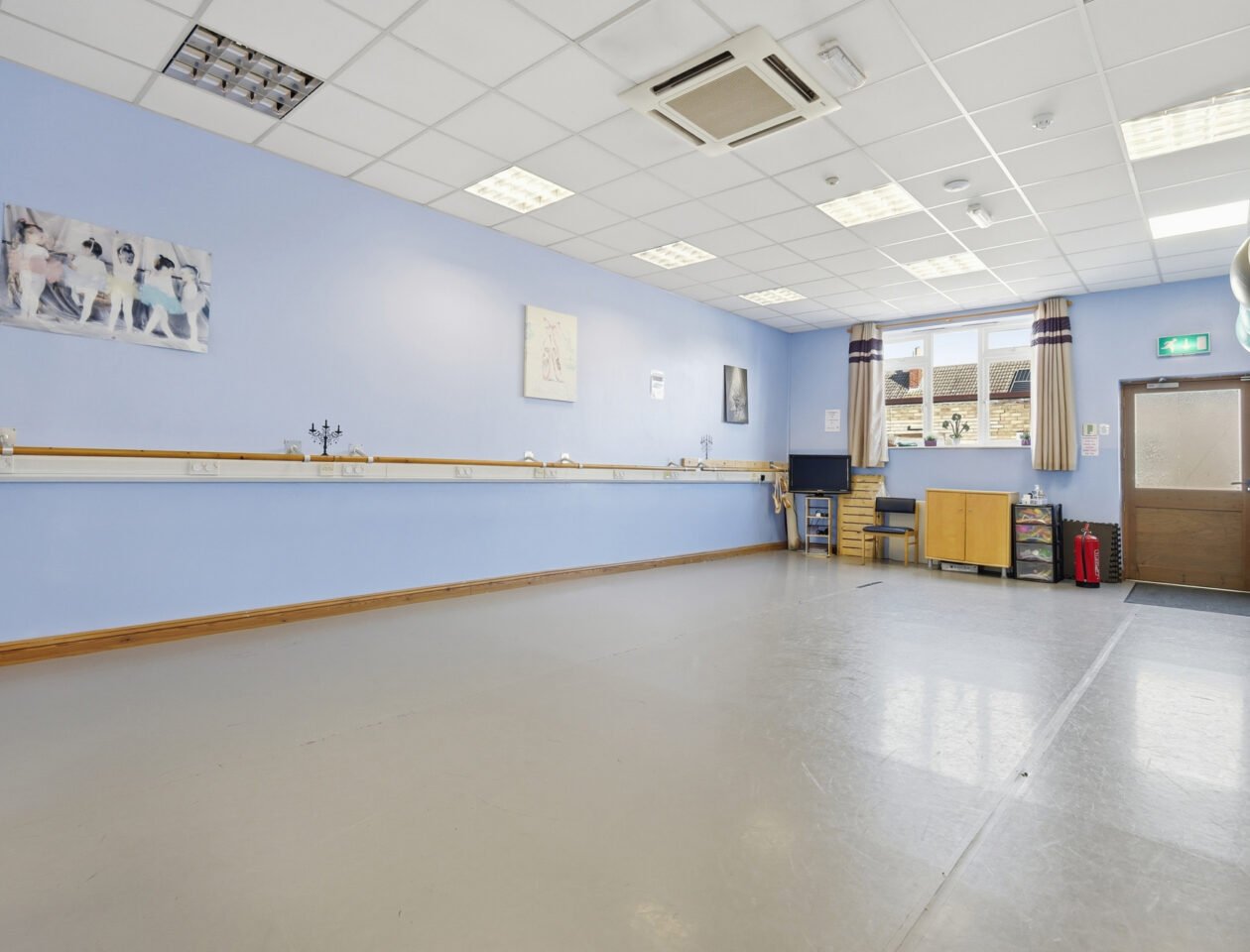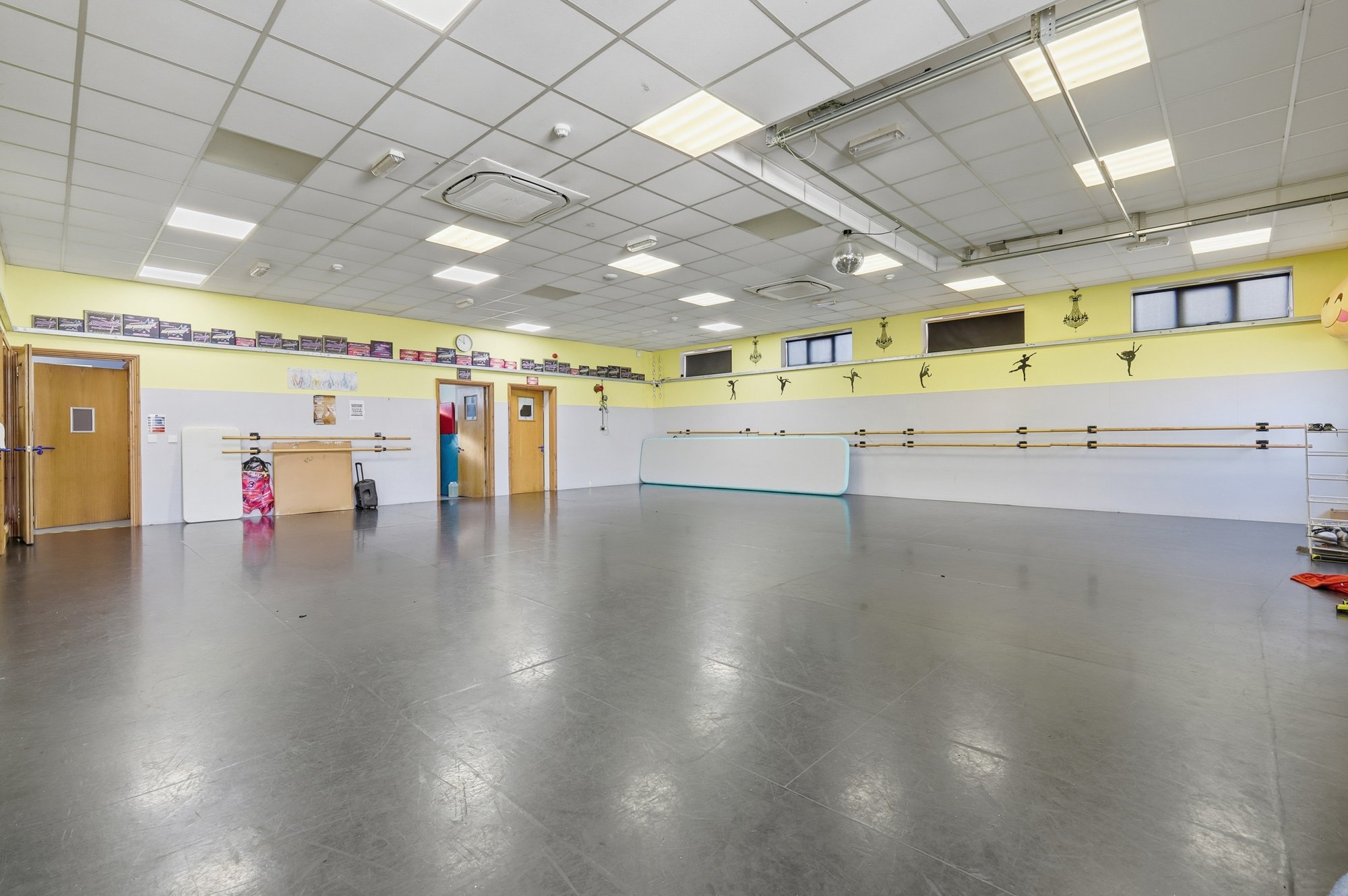 The property comprises two separate single-storey buildings, each offering well-presented and versatile accommodation. One building provides approximately 1,649 sq ft, featuring a former dance school layout with a generous open-plan studio and a series of supporting rooms suited to teaching, administration or specialist use.