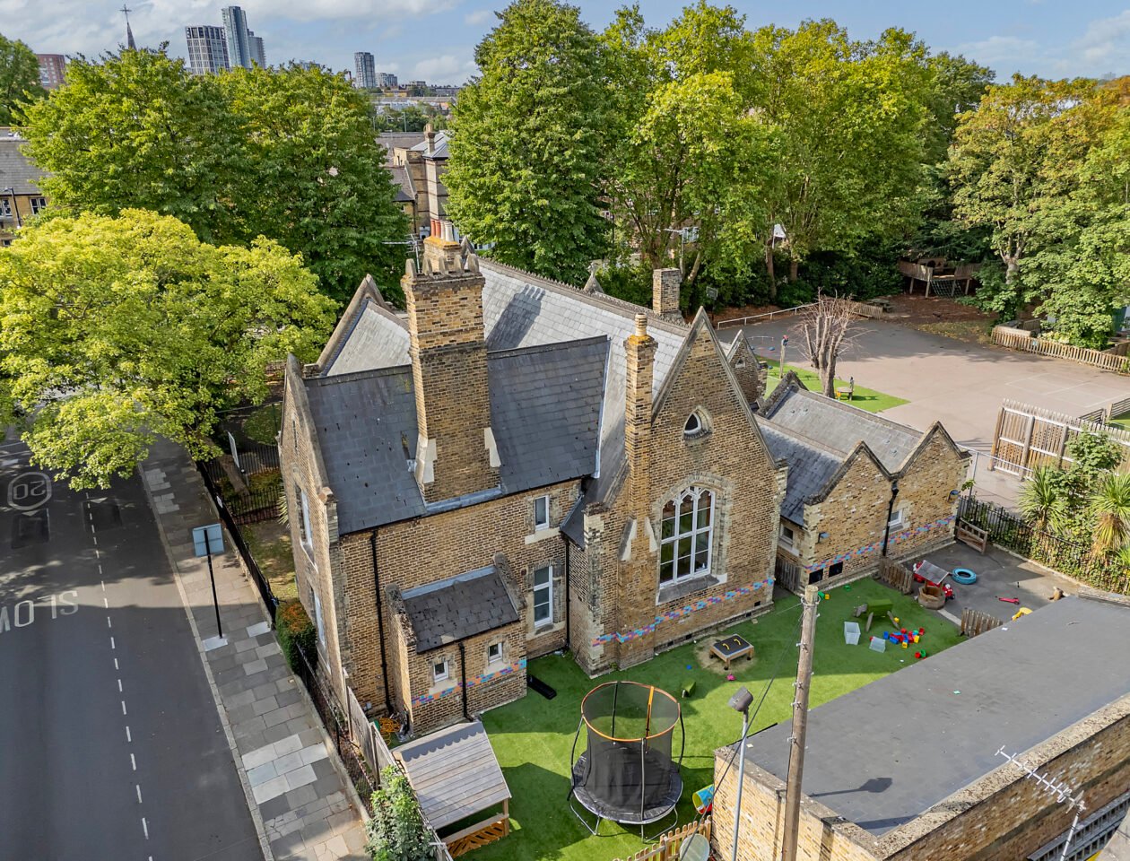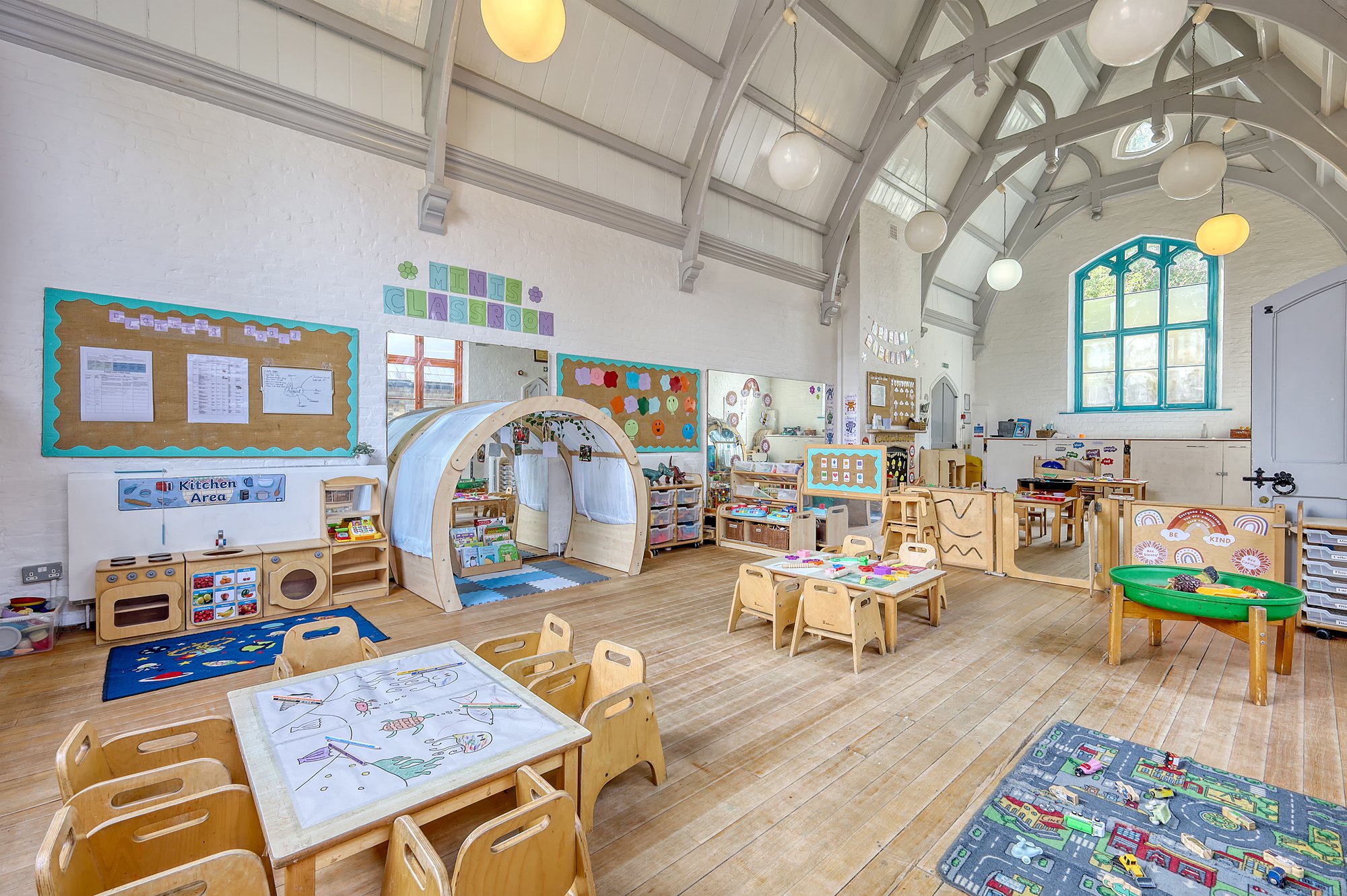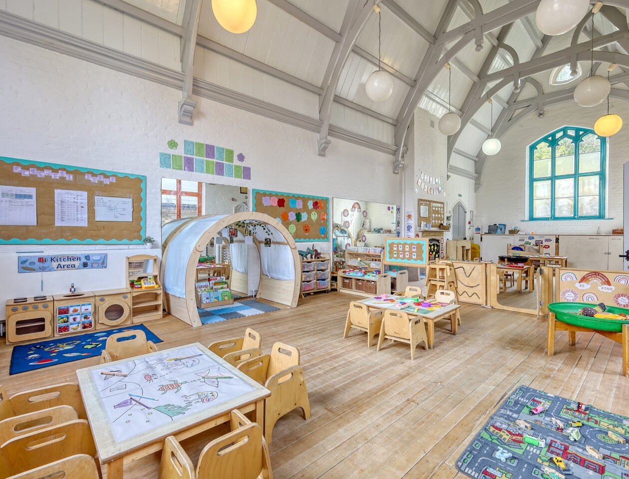 - Includes open playroom, hall, internal play area, kitchen, WCs and reception – with potential for reconfiguration