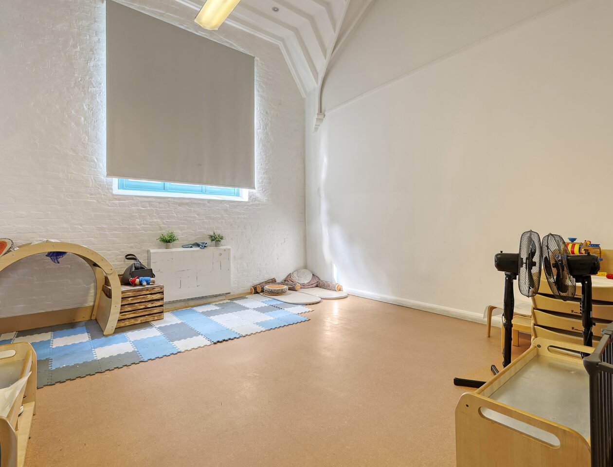 The property, formerly a Church, has been converted into a Children’s Nursery. The main hall provides a largely open-plan space, complemented by a secondary hall also used for childcare. On entry, visitors are welcomed directly into the main hall, with a rear hallway leading to the manager’s office, a good-sized kitchen, WCs, and storage facilities. To the rear, there is access to a self-contained garden, currently arranged as a children’s playground.