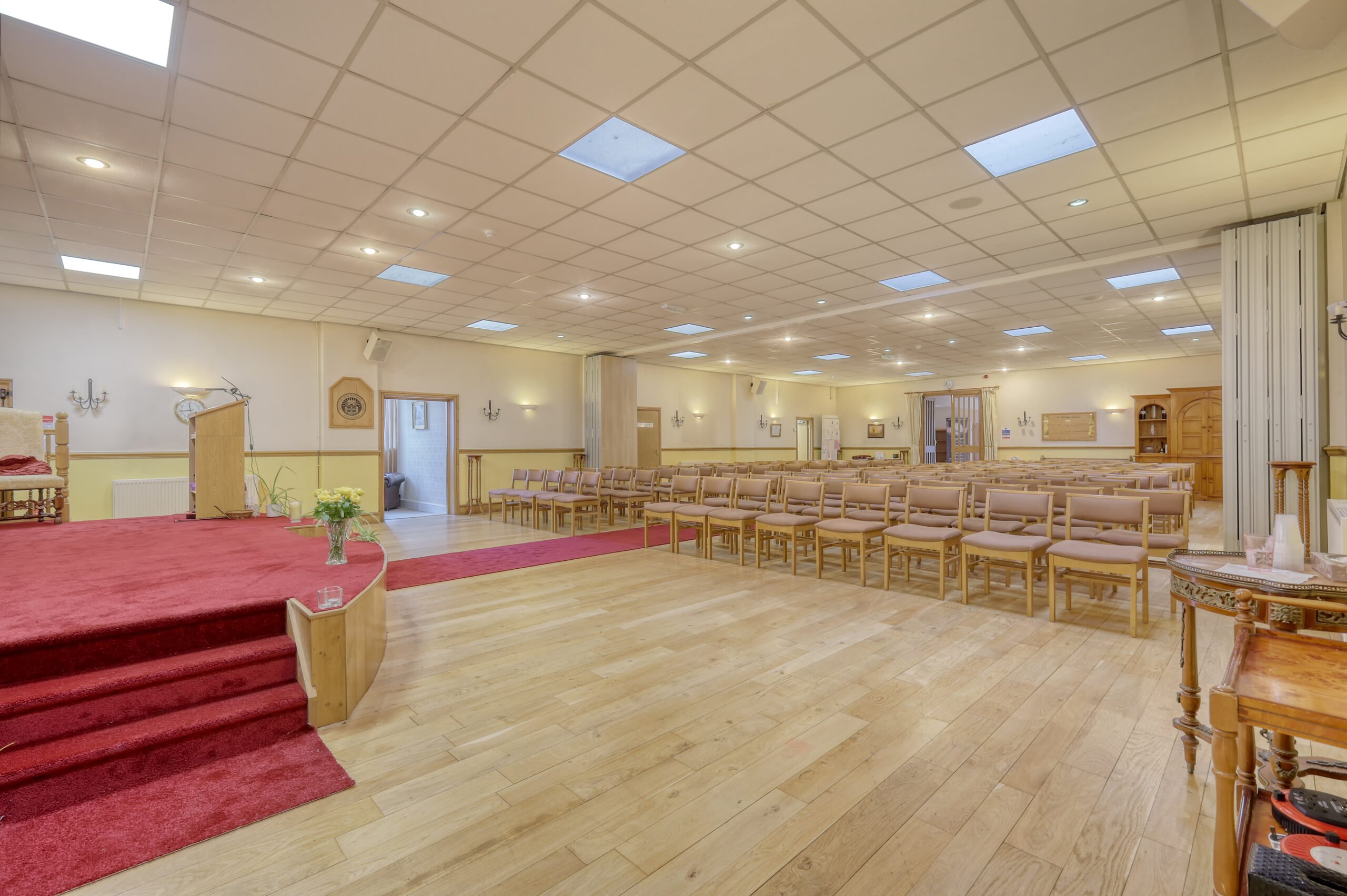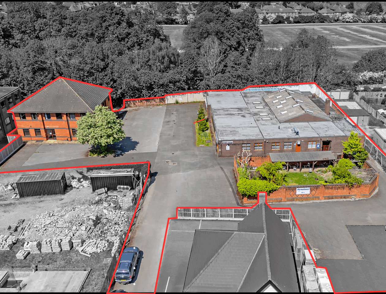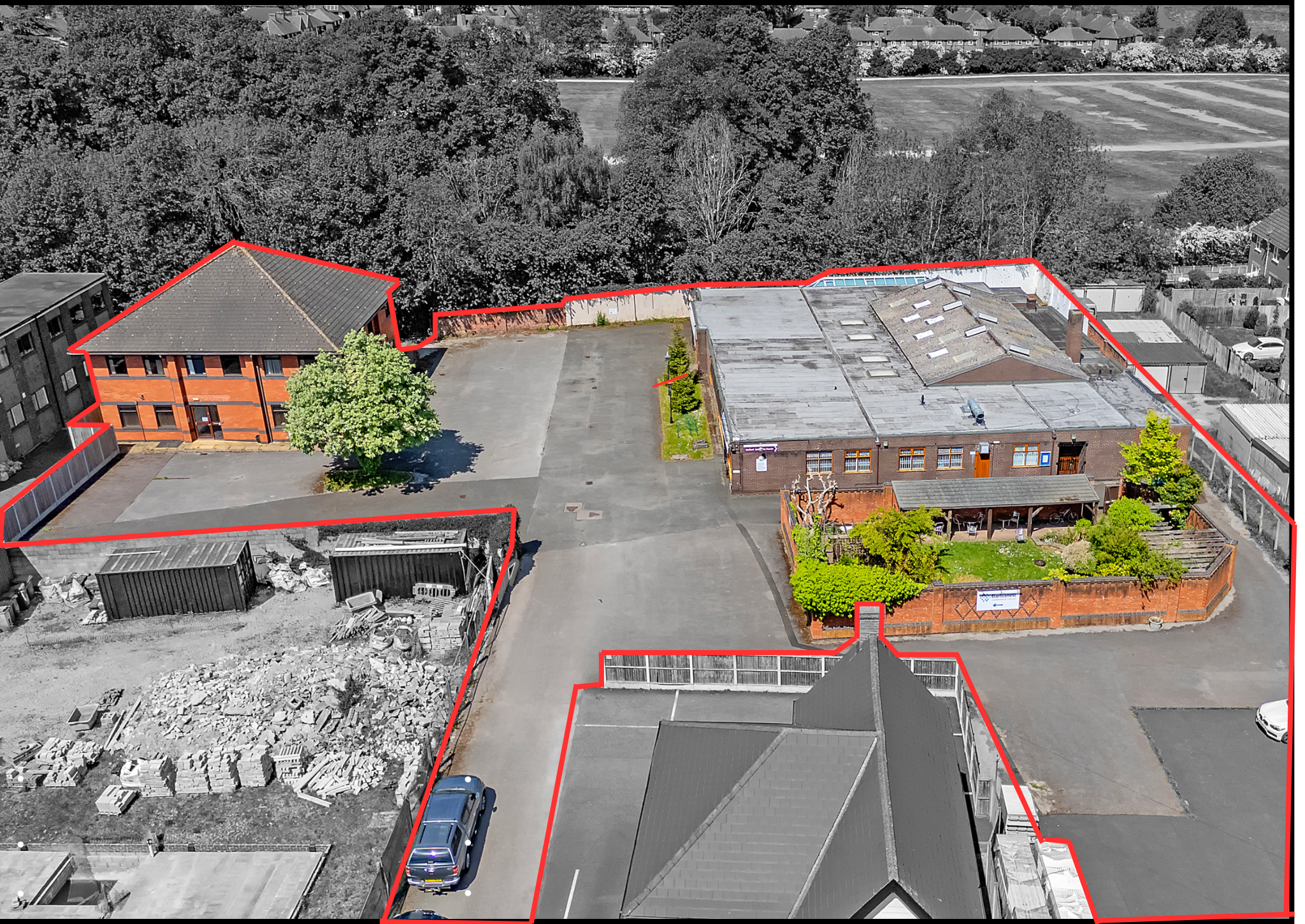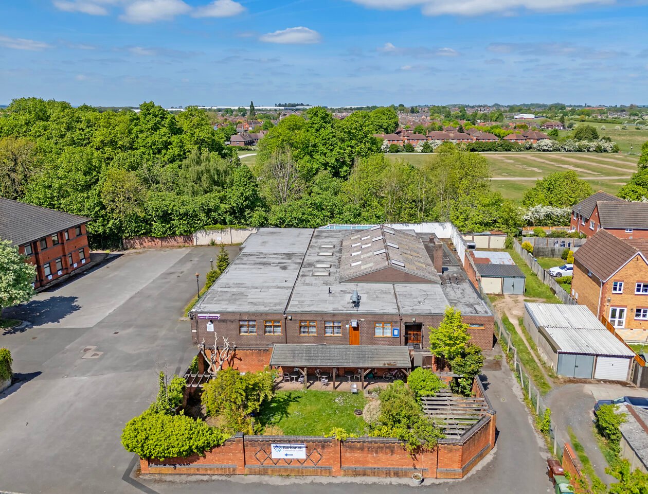 At the heart of the site lies a walled garden, directly north of which is a single-storey, brick-built F1 Use building providing a place of worship. There are two seperate conference halls each capable of seating 150+ people. There are further ancillary facilities including a kitchen, offices, meeting rooms, and WC’s. The building is maintained to a good standard and is approximately 9,561 sq. ft.